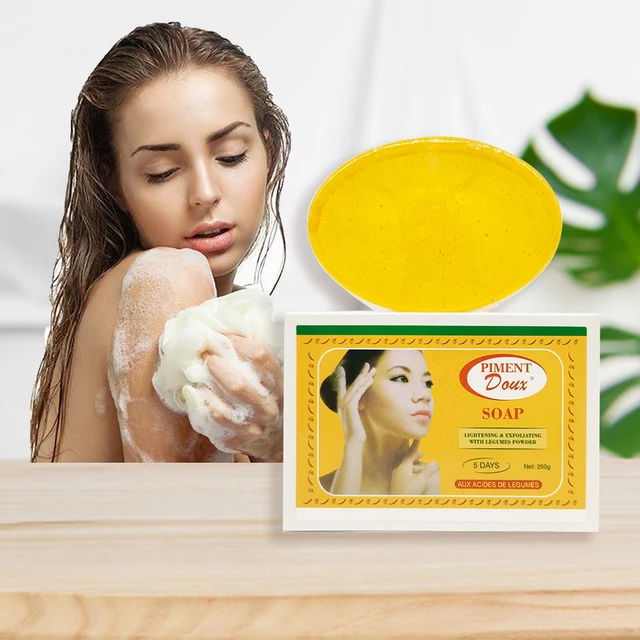 AUX ACIDES DE LEGUMES Le savon Piment Doux est un produit aux herves qui donne un resultat exceptionnel pour eclaircir et rajeunir la peau en 5 jours seulement. L’extrait de cheampignon “Songyi” contient des vitamines et antioxydants(anti-age), le lait de chevre adoucit, la poudre de perie d’Orient revitalise, la kitenine protege. Tous ces merveilleux composants, en association Avec le lait eclaircissant Piment Doux, regenerate la peau et font disparate Les taches de vieillesse ou de rousseur et I’hyperpigmentation en eclaircissant uninformed la peau. This Piment Doux soap is a natural herbal product that provides natural skin fairness. It removes blemishes, pigment scars, and sunburn spots in about 5 days of use; If used according to directions. It heals the previously damaged calls by exfoliation (dry skin will peel); while rejuvenating the growth of new skin by creating a new lighter, fairer, fresher skin tone. Directions: